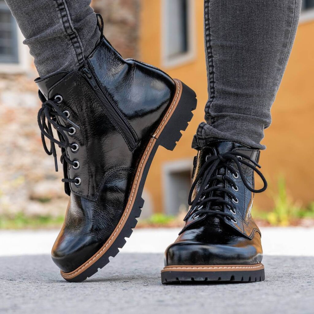 Stabilen na nogi, nedrseč na ulici in prava paša za oči: moden in udoben gležnjar iz vodo odbojnega lakiranega usnja. S toplo podlogo iz lodna in praktično zadrgo na notranji strani ter raztegljivim vstavkom na zunanji strani. Zamenljiv vložek in čudovito lahek podplat z grobim profilom.