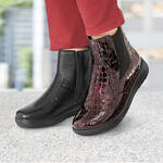 Elegantni nizki škornji iz mehkega napa usnja ali lakirano usnje z reliefnim krokodiljim vzorcem. Z širokim raztegljivim trakom za visoko prilagodljivost in z zadrgo na notranji strani. Topla podloga iz lodna, blažilni City-Sneaker podplat z zamenljivim vložkom.
